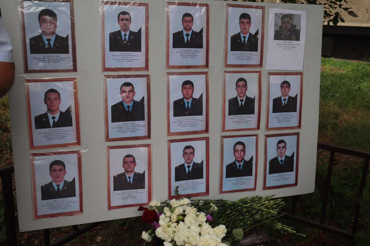 Цветы в память о сотрудниках полиции, погибших при исполнении служебного долга 23 июня в Махачкале и Дербенте, горожане несут в Сквер ветеранов МВД.