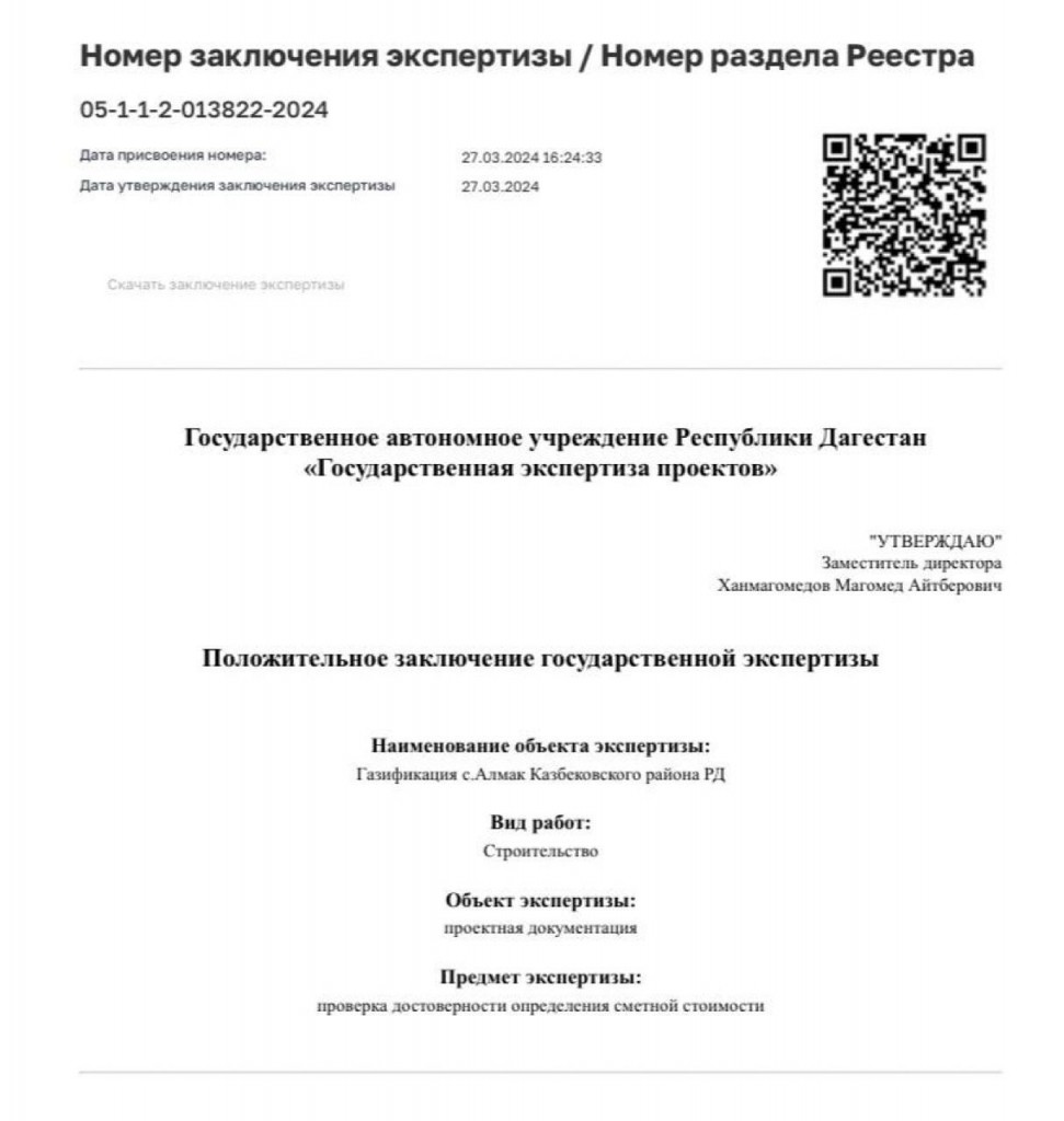 Получено положительное заключение экспертизы проектной документации по газификации селения Алмак.