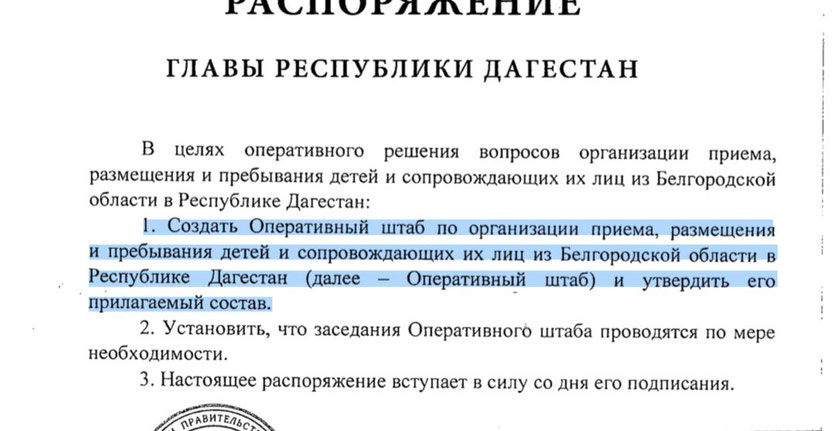 Создан оперштаб по приёму в Дагестане 500 детей из Белгородской области